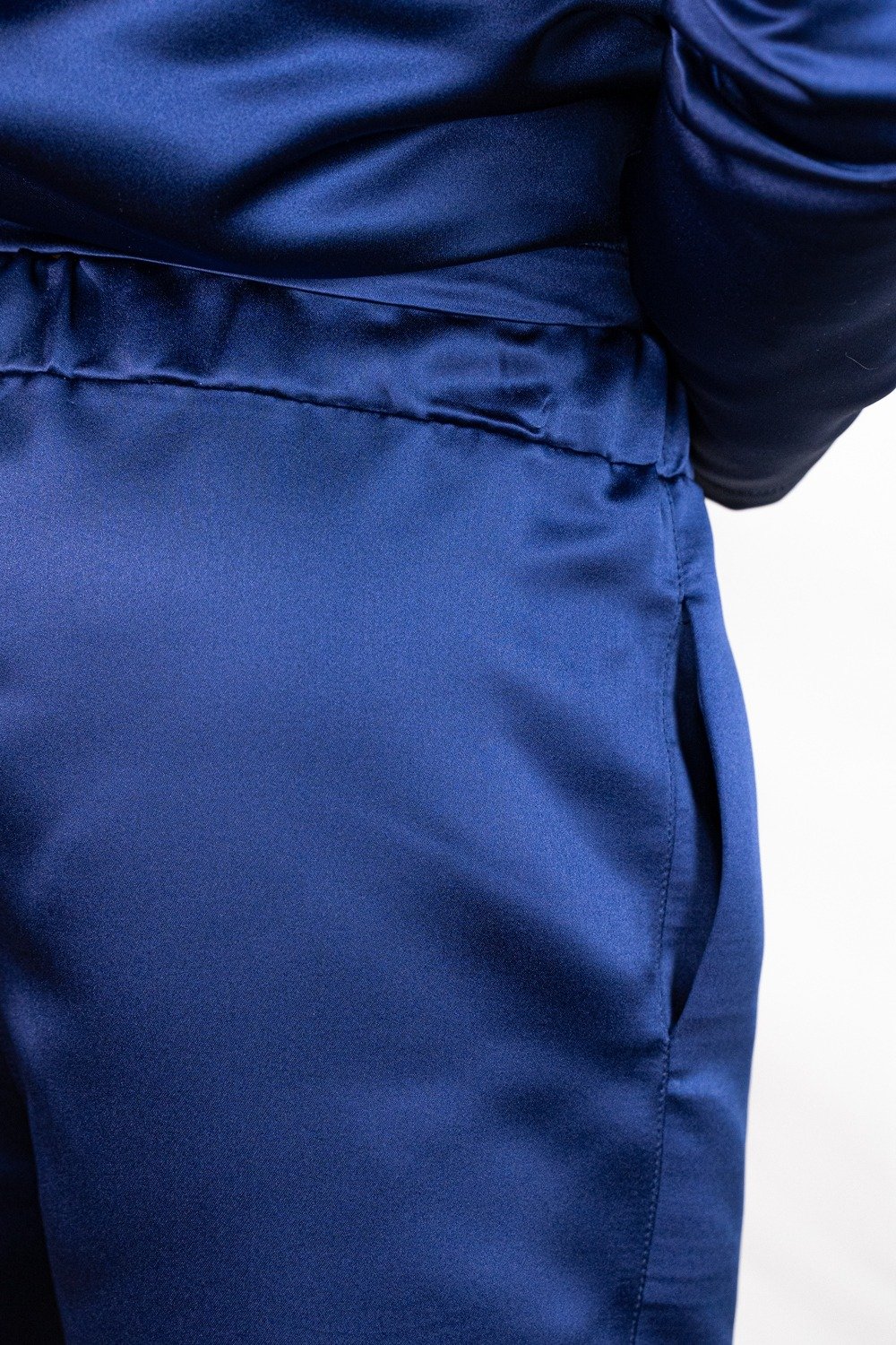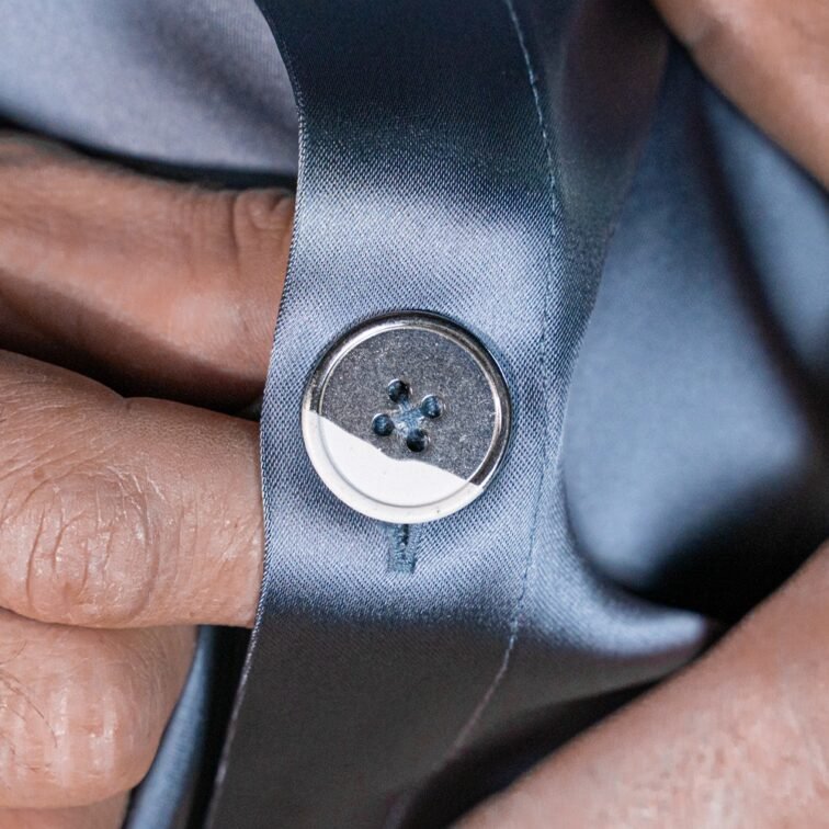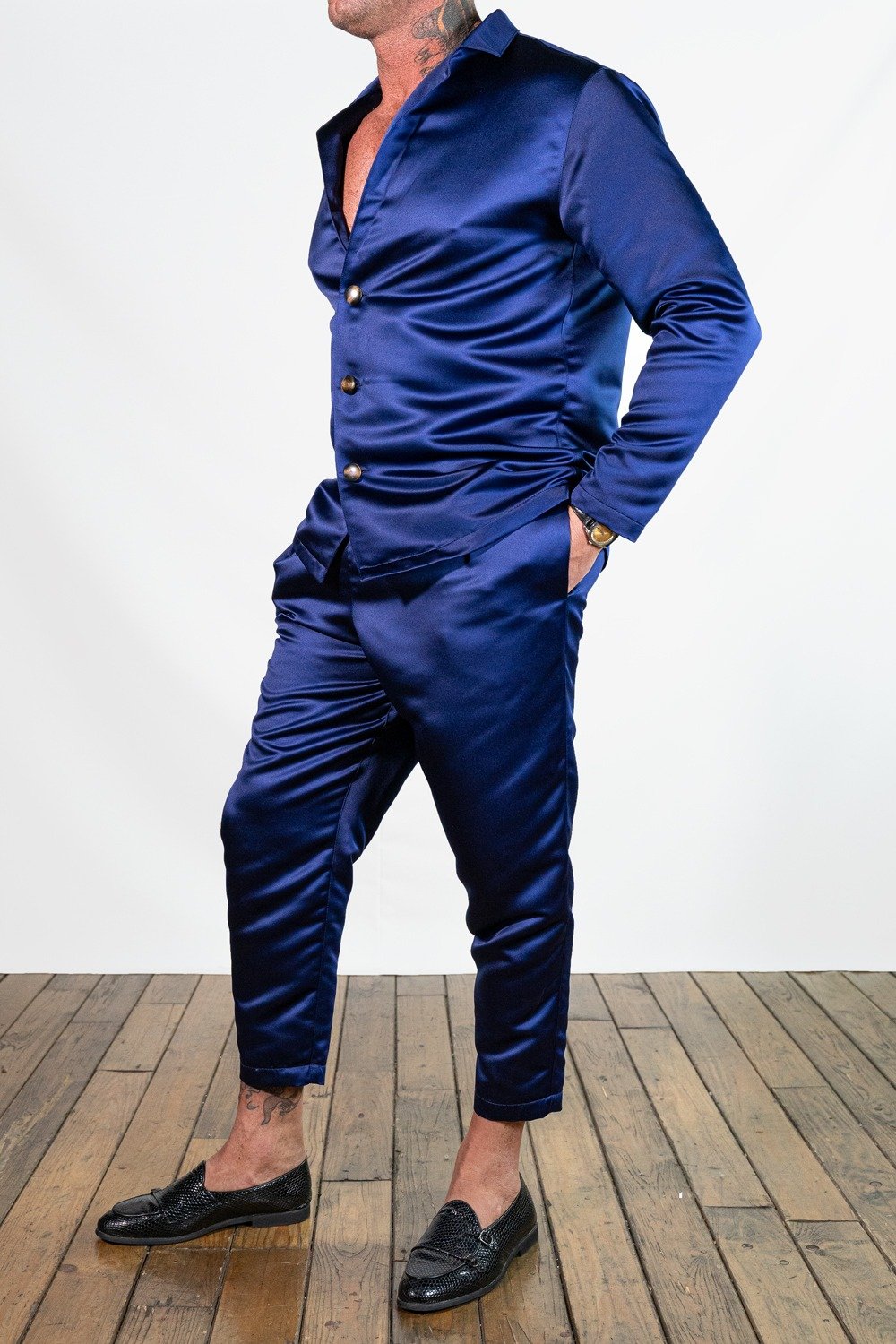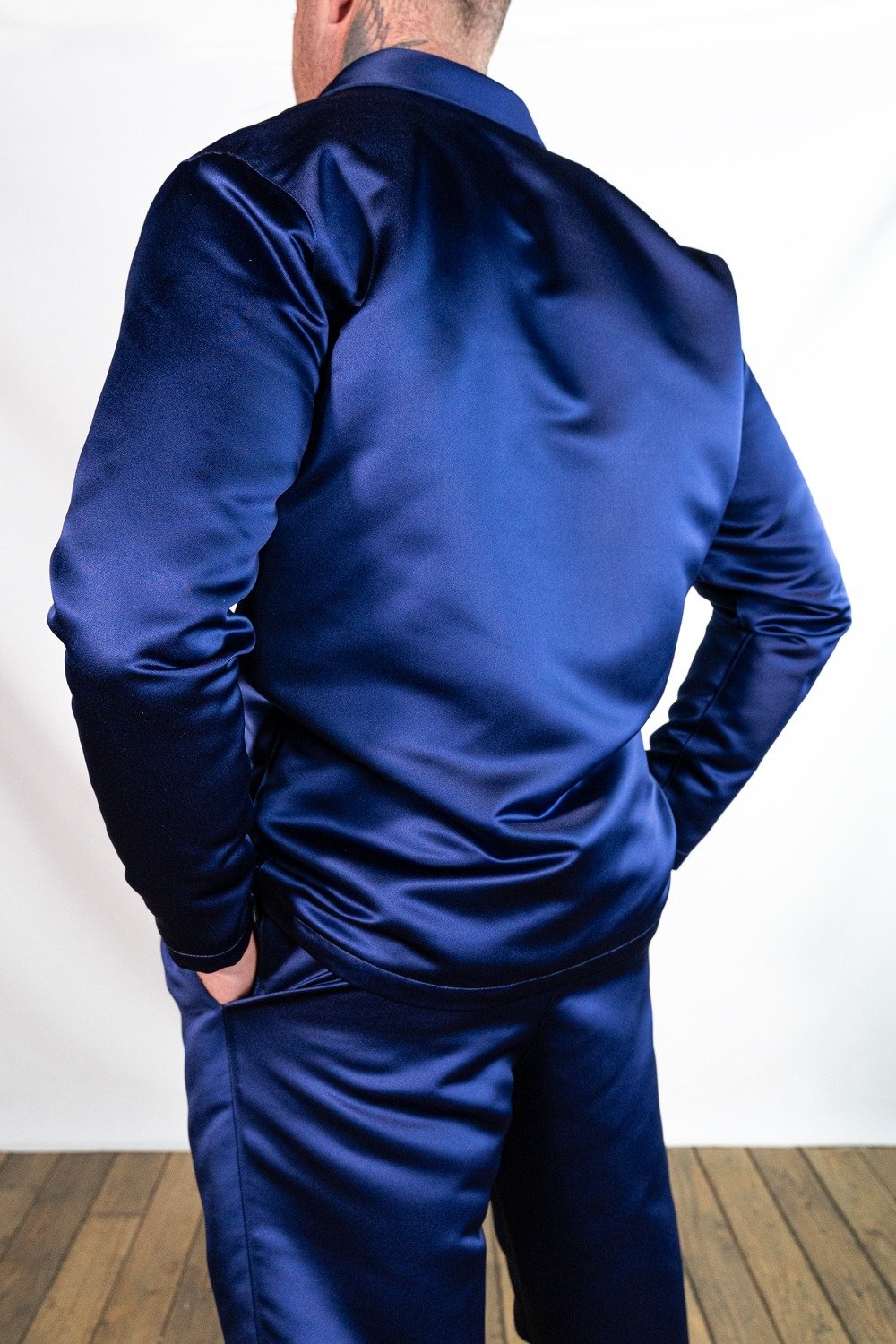L’abito in raso blu si presta a molteplici interpretazioni: abbinato a scarpe lucide e accessori minimal per un outfit formale, oppure a mocassini per un look più rilassato ma sempre ricercato. Il contrasto tra la texture brillante del raso e il taglio sartoriale tradizionale dona al capo una versatilità unica.