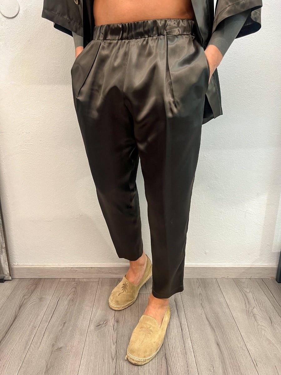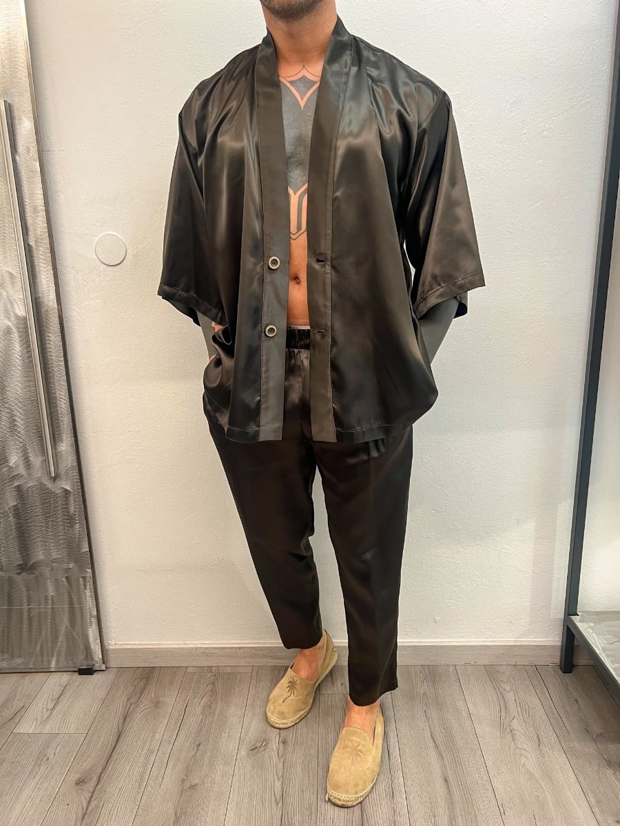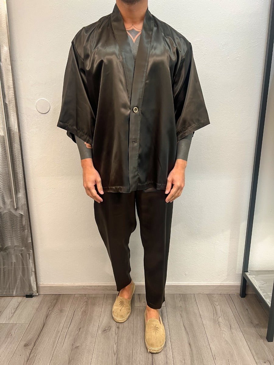 Questo abito include un pantalone con elastico, che garantisce una vestibilità comoda e adatta a tutte le forme del corpo. Senza bottoni o cerniere, il pantalone può essere indossato facilmente e senza sforzo. La giacca, dotata di bottoni e colletto koreano, è reversibile, offrendo la possibilità di cambiare look in base all’occasione.
