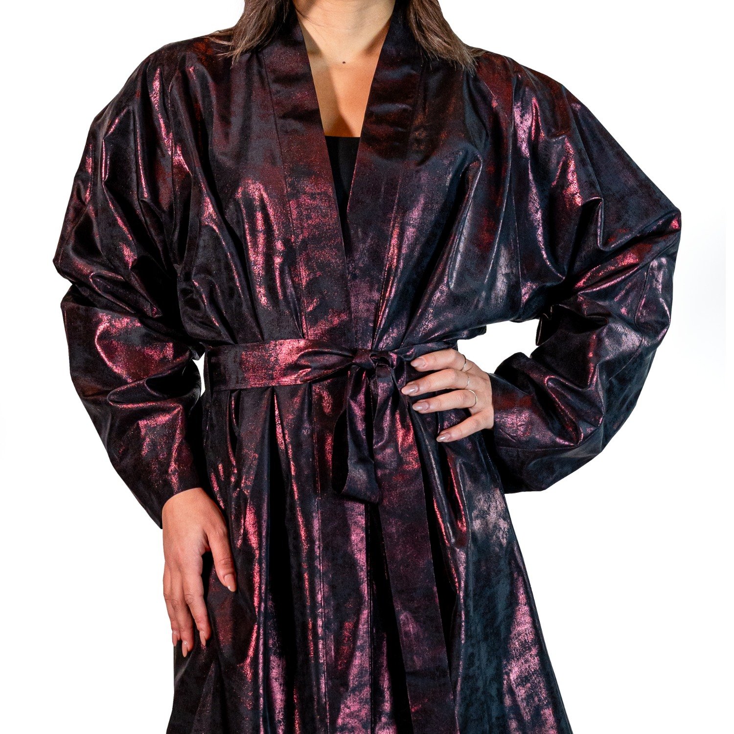 Questo kimono è perfetto per serate eleganti o eventi speciali, ma si adatta anche a contesti più informali. Indossalo aperto per un look rilassato e trendy, o chiuso con la cintura per un outfit strutturato e d’effetto. La combinazione di nero e rosso bruciato si presta a essere abbinata a capi monocromatici o accessori minimal per valorizzare il design unico.